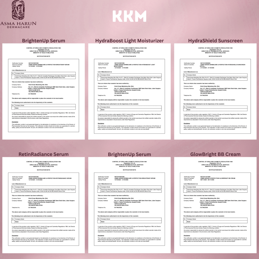Ya, semua produk Asma Harun Dermacare diperbuat di kilang bertaraf GMP, dan berdaftar dengan Kementerian Kesihatan Malaysia (KKM).
